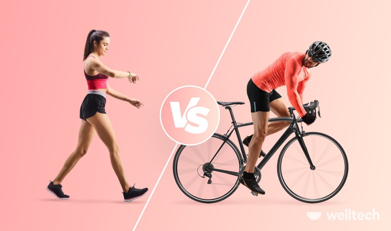 Di sisi lain, bersepeda termasuk olahraga aerobik yang lebih intens dan melibatkan otot-otot tubuh bagian bawah secara luas, seperti otot paha depan, hamstring, betis, serta otot bokong. Karena gerakan pedal yang konstan dan ritmis, bersepeda dapat meningkatkan kapasitas paru-paru dan daya tahan kardiovaskular lebih cepat dibanding sebagian besar sesi jalan kaki. Selain itu, aktivitas ini menempatkan sedikit beban pada sendi karena tubuh sebagian besar didukung oleh sepeda, sehingga cocok bagi mereka yang ingin mengurangi stres pada lutut atau pinggul.