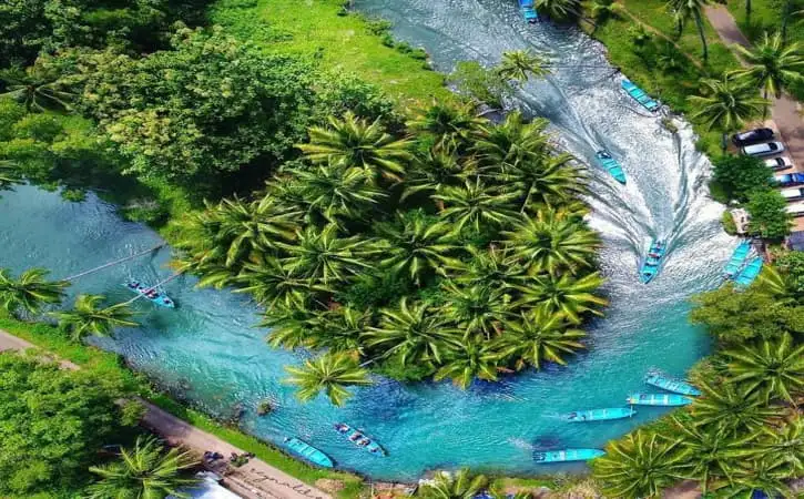 Saat menyusuri sungainya, Anda akan disuguhi pemandangan yang tak kalah memukau. Pohon kelapa dan vegetasi hijau tumbuh subur di kanan kiri sungai, menciptakan ilusi seolah Anda sedang berpetualang di sungai tropis di belahan dunia lain.