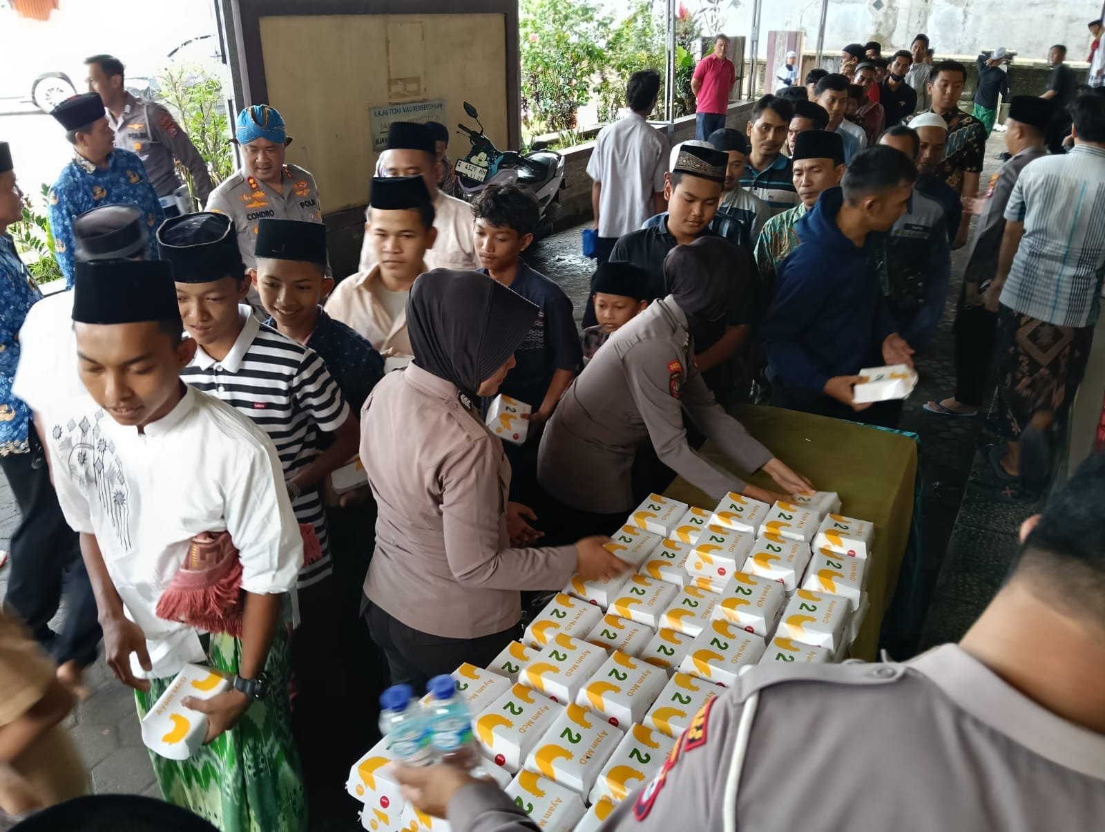 Antusiasme tampak jelas dari para jemaah yang menerima paket makan siang tersebut. Senyum dan sapaan hangat menghiasi suasana, menciptakan momen keakraban yang penuh kekeluargaan. Warga menyambut baik kegiatan tersebut dan mengapresiasi kehadiran Kapolres beserta jajaran yang turun langsung ke tengah masyarakat. Interaksi yang terjalin secara langsung ini membuat jarak antara aparat dan warga terasa semakin dekat.